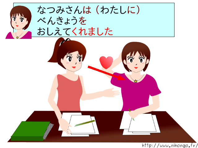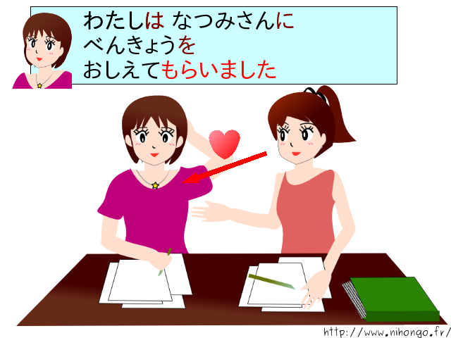 わたしは 夏美さんに 勉強を 教えてもらいました。