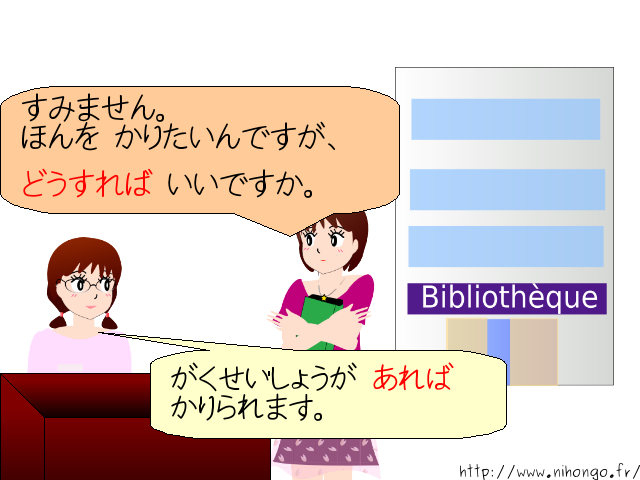「本を 借りたいんですが、どうすれば いいですか。」「学生証が あれば 借りられます。」